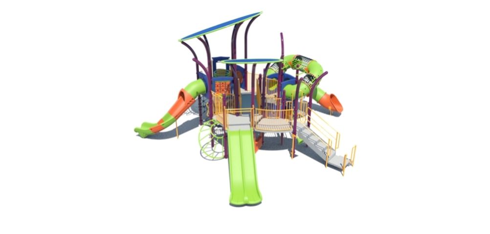Playcraft Commercial Post & Deck Playground - vibrant structure with green slides, climbing nets, and canopy. - banner